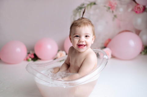 When Madison first got here to my studio, she looked at me like I was a crazy person, because I really am when trying to get babies to smile! 😅😅 But she quickly warmed up to me and was giving me her ornery grins in no time! As you will see on the photos below, not only did she love her cake smash, but she was the biggest splasher I have had yet! This made it so much fun for me as the photographer because I love capturing the water going every where in the photos. There were so many of those water shots, and in each one Madison had the biggest smile on her face! Definitely one of the best perks of the job!